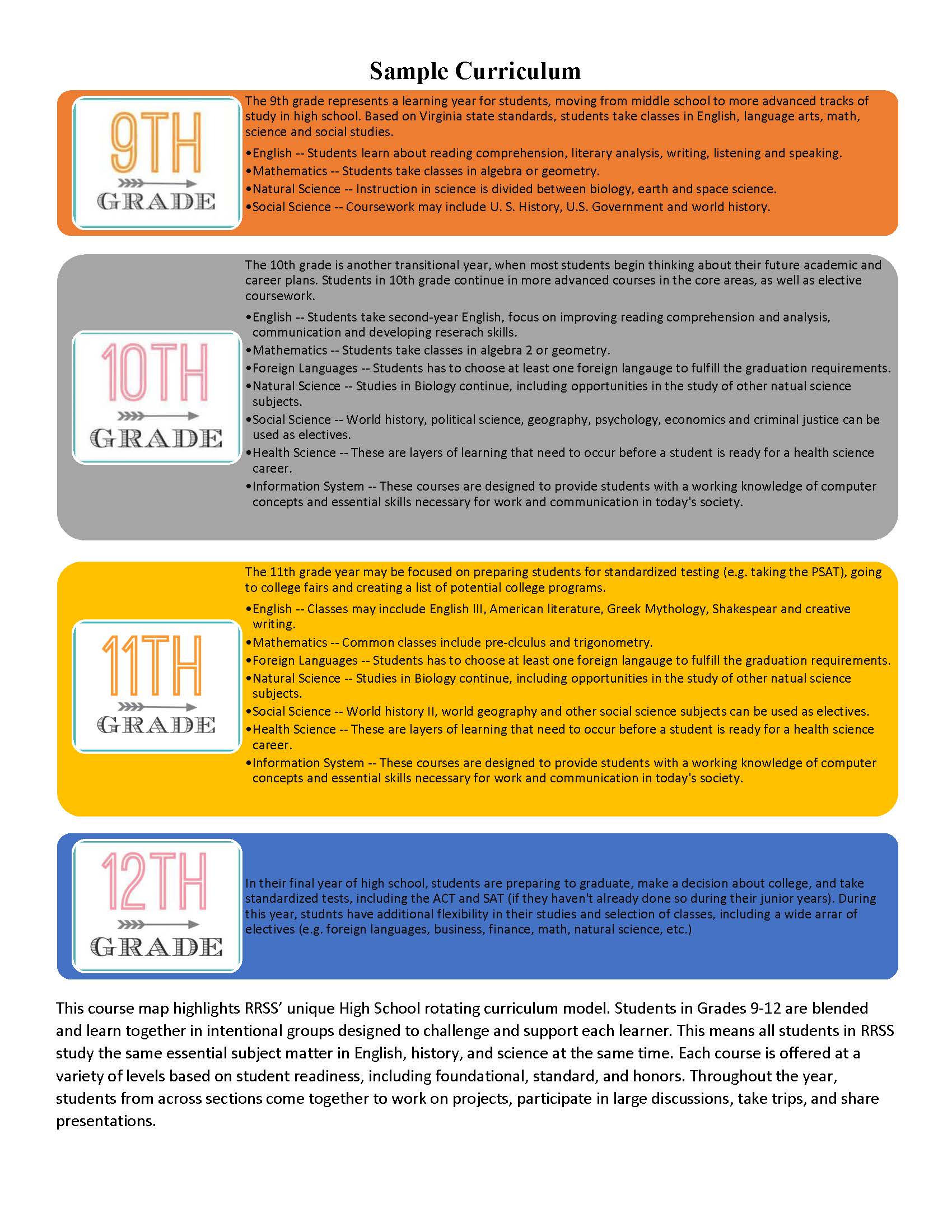 Ronald Reagan Secondary School’s curriculum emphasizes the mastery of four core subjects, English, history/social sciences, laboratory sciences, and mathematics. Thus, these core courses are allotted more time than elective courses in the daily schedule and are, correspondingly, worth more academic credits.